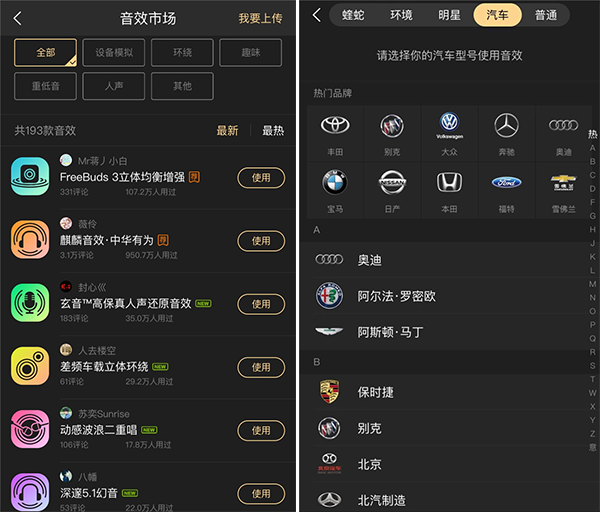 打开酷狗蝰蛇音效 - 耳机音效场景,可看到目前已支持适配42个主流耳机品牌,为听众提供逾万款专属定制音效,并获得3457万用户对耳机音效的青睐。而在汽车音效场景下,蝰蛇音效共提供1018款汽车音效,适配包括保时捷、宝马、大众、福特在内的各档多品牌车型,同品牌用户甚至将音效社区作为了车迷交流空间。