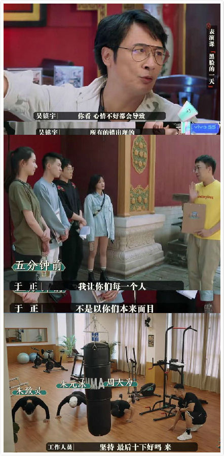 在,的第五期节目里,有多位专业导师都给出了更加高难度的题目。其一,生活在戏中。生活的自己与所拍摄的影视剧的角色如何分开,对于很多演员来说是一个很大的挑战。而为了让这些年轻演员们能真正的能明白这些,吴镇宇也给他们上了一节“特殊”的课程,让所有演员们演绎“黑脸的,”。还有生活在戏中这堂课,于正也用了一个特殊的方式。就是“整蛊”明星嘉宾尹正,让上课的学生在一开始就“演绎”一个和自己完全不同性格的人。其二,迅速减肥。制片人于正和导师张颂文,安排演员们在限定的时间内创作一个简单的原创剧本,而且女生还要在限定的时间内增肥,男生要完成增肌的任务。面对导师们这么多项的演技挑战,演员们也勇敢地应对并领会到了“人生如戏,戏如人生”的这个道理。