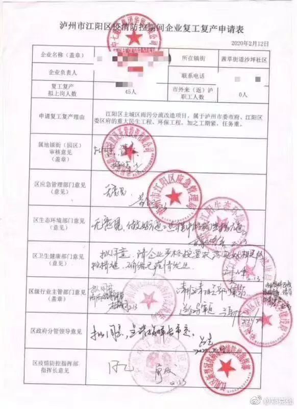 我们关注到企业在复工的过程中,面临着不少的“麻烦事”。比如近日,就有这么一张《泸州市江阳区疫情防控期间企业复工复产申请表》在网上频传。