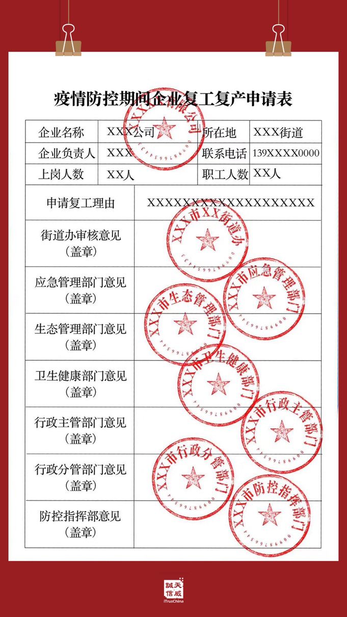 在这张表上,某企业的复工申请表,被密密麻麻地盖上了来自环保、应急管理、卫健等多部门及区政府、区疫情防控指挥部等8个公章,以及一个企业公章。虽然同日晚间,泸州市江阳区委宣传部确认该区已取消此审签备案程序,但为了在企业复工的情况下严控疫情,各地都还是有很多流程和审批少不了。